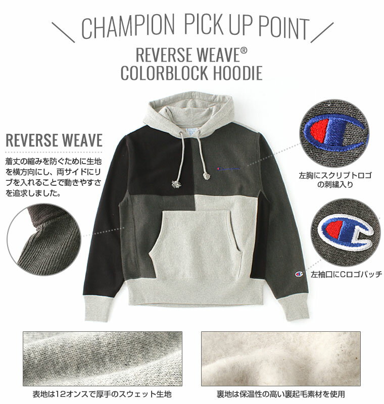 ⇒Champion(チャンピオン)特集はコチラ 【アイテム解説】 MEN'S CHAMPION REVERSE WEAVE COLORBLOCK HOODIE1919年にニューヨーク州チェスターで誕生したchampion(チャンピオン)は、デザイン・機能性・素材・縫製・価格と、全てに対してハイパフォーマンスでアスリートからストリートまで納得できるアイテムを提供し続けています。